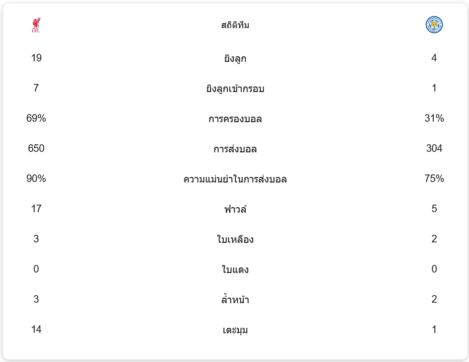 ลิเวอร์พูลมีโอกาสยิงทั้งหมด 19 ครั้ง เข้ากรอบ 7 ครั้ง และครองบอล 69% เทียบกับเลสเตอร์ที่ยิงเพียง 4 ครั้ง เข้ากรอบ 1 ครั้ง แสดงให้เห็นถึงความเหนือกว่าทางด้านการบุกของลิเวอร์พูลที่เด่นชัด