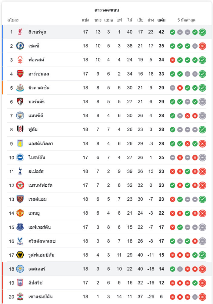 ลิเวอร์พูลยังคงรั้งตำแหน่งจ่าฝูงของพรีเมียร์ลีก 2024 ด้วยคะแนนรวม 42 แต้มจาก 17 นัด ทิ้งห่างคู่แข่งเชลซีที่อยู่อันดับสอง ขณะที่เลสเตอร์ยังคงจมปลักท้ายตารางในอันดับ 18 ด้วยเพียง 14 แต้ม