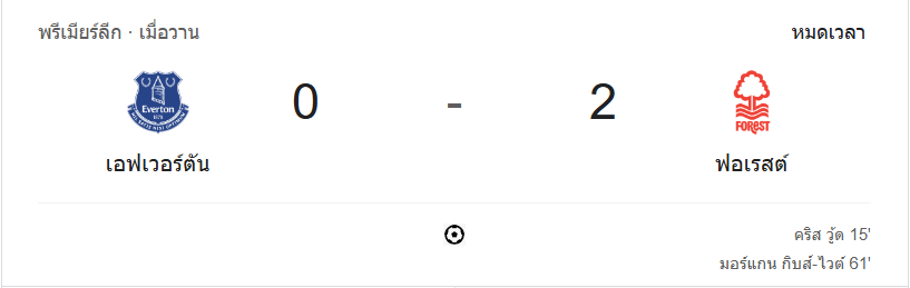 น็อตติ้งแฮม ฟอเรสต์ โชว์ฟอร์มแกร่ง บุกมาเอาชนะเอฟเวอร์ตันได้ถึงถิ่น ด้วยประตูสำคัญจาก คริส วู้ด และ มอร์แกน กิ๊บส์-ไวท์ ด้านเอฟเวอร์ตันแม้จะพยายามทวงคืนเกมในครึ่งหลัง แต่ก็ไม่สามารถทำอะไรแนวรับของฟอเรสต์ได้ เกมนี้เป็นเครื่องยืนยันถึงฟอร์มการเล่นที่แข็งแกร่งของทีมเยือน และสร้างความหวังให้แฟนบอลได้อย่างยอดเยี่ยม