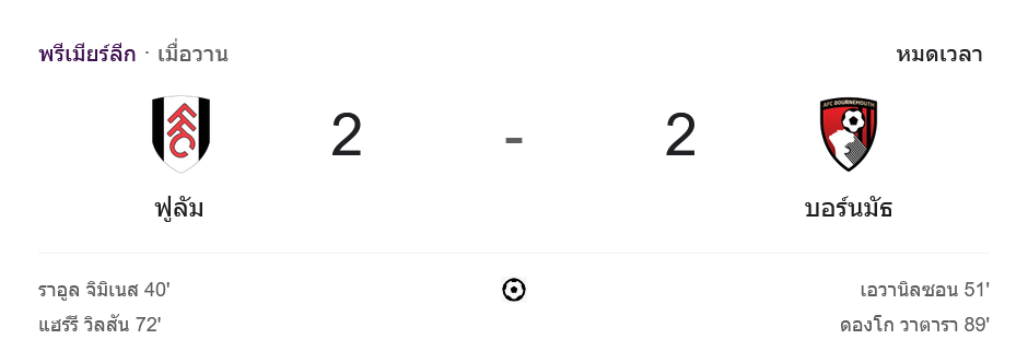 - ⚽ นาทีที่ 89: ดองโก วาตารา ยิงตีเสมอให้บอร์นมัธ 2-2