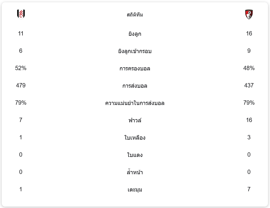 เกมนี้ฟูแล่มมีเปอร์เซ็นต์การครองบอลที่ 52% และการจ่ายบอลแม่นยำถึง 79% ส่วนบอร์นมัธครองบอลได้ 48% แต่มีโอกาสยิงมากถึง 16 ครั้ง แสดงให้เห็นถึงความพยายามของทั้งสองทีมในการสร้างโอกาสทำประตู