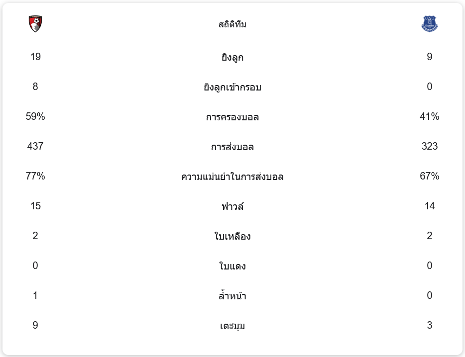 บอร์นมัธมีโอกาสยิงทั้งหมด 19 ครั้ง โดยเข้ากรอบ 8 ครั้ง ขณะที่เอฟเวอร์ตันยิงเพียง 9 ครั้ง และไม่สามารถส่งลูกเข้ากรอบได้เลย ความแม่นยำในการส่งบอลของบอร์นมัธอยู่ที่ 77% ซึ่งเหนือกว่าเอฟเวอร์ตันที่ทำได้เพียง 67% การครองบอลของบอร์นมัธอยู่ที่ 59% แสดงถึงความได้เปรียบในเกมนี้