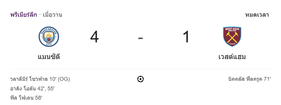 - ⚽ 58’ ฟิล โฟเดน แมนเชสเตอร์ ซิตี้ 4-0