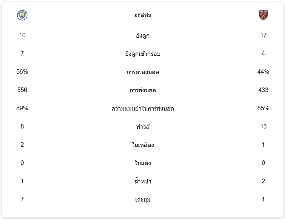 แมนเชสเตอร์ ซิตี้ ครองบอลถึง 56% และมีความแม่นยำในการส่งบอลสูงถึง 89% แม้ว่าจำนวนครั้งยิงจะน้อยกว่าเวสต์แฮม แต่ประสิทธิภาพในการเข้าทำถือว่ายอดเยี่ยม โดยยิงเข้ากรอบได้ถึง 7 ครั้งจากทั้งหมด 10 ครั้ง