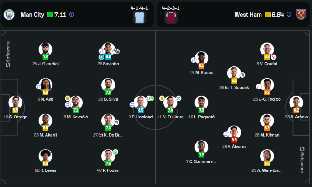 แมนเชสเตอร์ ซิตี้ ใช้แผนการเล่นแบบ 4-1-4-1 ที่เน้นการคุมบอลในแดนกลางและการเปิดเกมรุกที่รวดเร็ว โดยมีฮาแลนด์เป็นตัวจบสกอร์หลัก ในขณะที่เวสต์แฮมพยายามตั้งรับอย่างเหนียวแน่นด้วยแผน 4-2-3-1 แต่ไม่สามารถหยุดเกมบุกที่มีความหลากหลายของซิตี้ได้