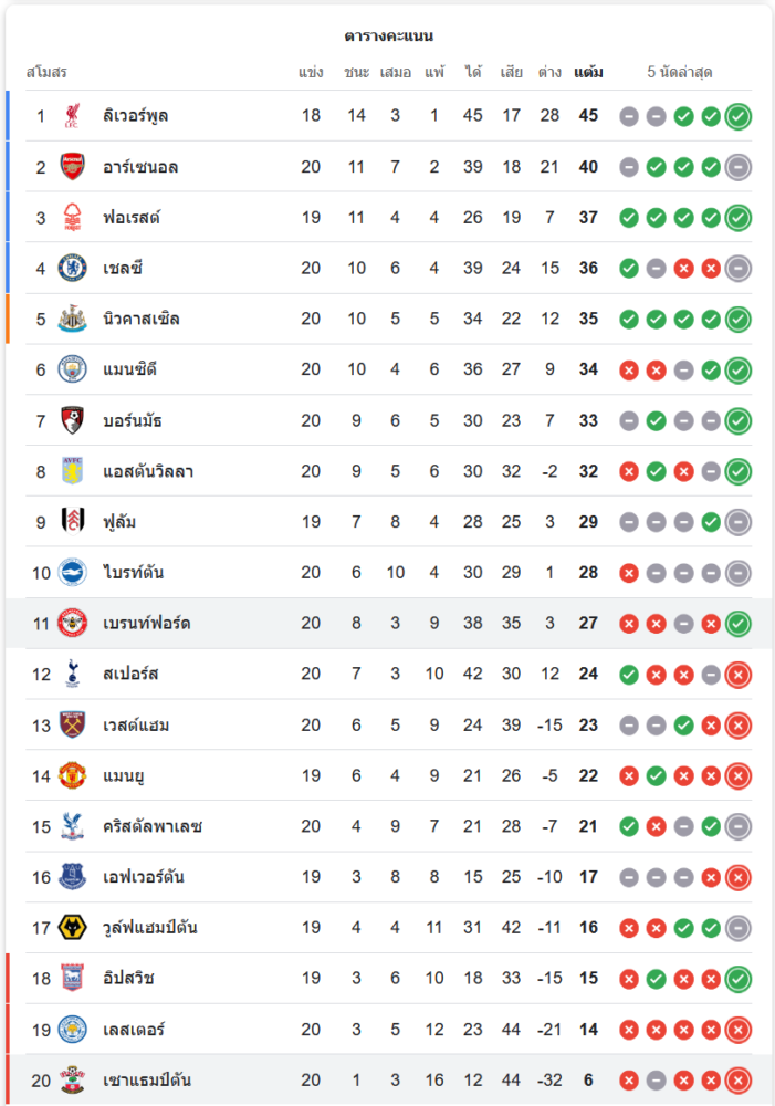 หลังจบเกมนี้ เบรนท์ฟอร์ด ขยับขึ้นมาอยู่อันดับ 11 มี 27 คะแนนจาก 20 นัด ส่วน เซาแธมป์ตัน ยังคงจมบ๊วยอันดับ 20 มีเพียง 6 คะแนนจาก 20 นัด สถานการณ์ตกชั้นดูน่าเป็นห่วงอย่างมาก