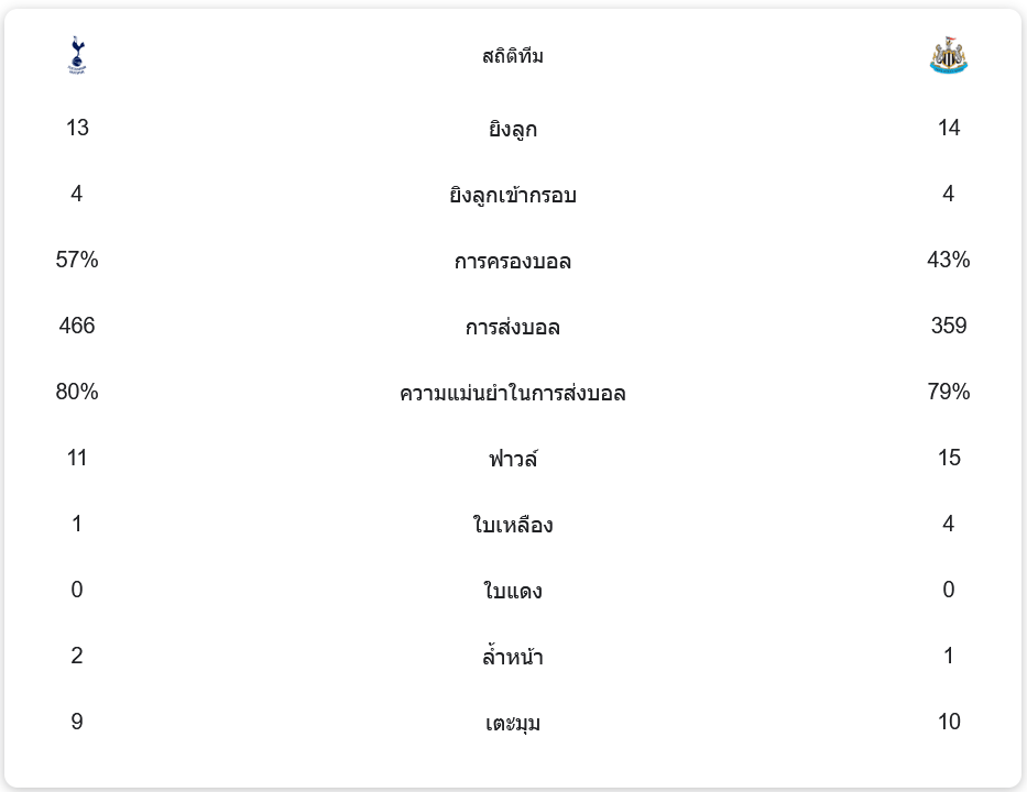 ทั้งสองทีมมีโอกาสยิงใกล้เคียงกัน โดยสเปอร์สยิงทั้งหมด 13 ครั้ง เข้ากรอบ 4 ครั้ง ขณะที่นิวคาสเซิลยิง 14 ครั้ง และเข้ากรอบ 4 ครั้งเช่นกัน แต่ทีมเยือนมีประสิทธิภาพในเกมรุกมากกว่า การครองบอลอยู่ที่ 57% ต่อ 43% สำหรับสเปอร์ส แต่ความแม่นยำในการส่งบอลของนิวคาสเซิลถึง 79% เหนือกว่าเล็กน้อย