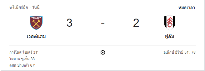 ผลบอลสด พรีเมียร์ลีก 2024 ระหว่าง ทีม เวสต์แฮมยูไนเต็ด vs ฟูแล่ม วันนี้ 15/1/68 ดูบอลย้อนหลัง คลิปไฮไลท์ ดูบอลพรีเมียร์ลีก 2024