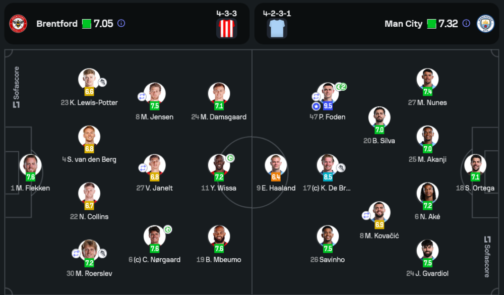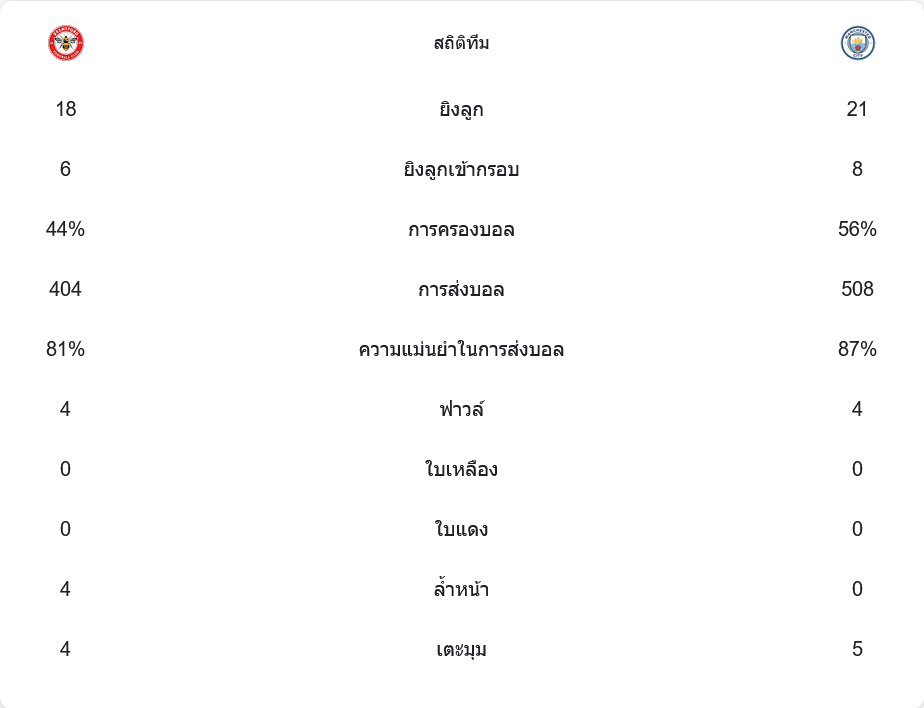 เกมนี้ แมนเชสเตอร์ ซิตี้ มีความได้เปรียบในเรื่องการครองบอลที่ 56% และการส่งบอลที่แม่นยำ 87% ขณะที่ เบรนท์ฟอร์ด เน้นเกมสวนกลับและมีโอกาสยิงเข้ากรอบถึง 6 ครั้งจากทั้งหมด 18 ครั้ง ทั้งสองทีมมีความดุดันที่เท่ากันด้วยจำนวนฟาวล์ 4 ครั้ง แต่ไม่มีใบเหลืองหรือใบแดง