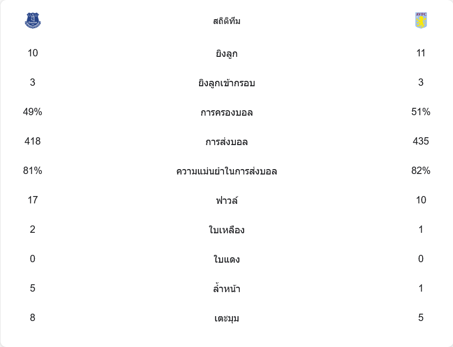 เกมนี้ทั้งสองทีมมีโอกาสยิงเท่ากันที่ 11 ครั้ง โดยเข้ากรอบเพียง 3 ครั้งทั้งสองฝ่าย วิลล่าครองบอลมากกว่าเล็กน้อยที่ 51% แต่จ่ายบอลแม่นยำกว่า 82% เมื่อเทียบกับ 81% ของเอฟเวอร์ตัน เอฟเวอร์ตันทำฟาวล์ถึง 17 ครั้งและโดนใบเหลือง 2 ใบ ขณะที่วิลล่าทำฟาวล์เพียง 10 ครั้งและได้ใบเหลือง 1 ใบ
