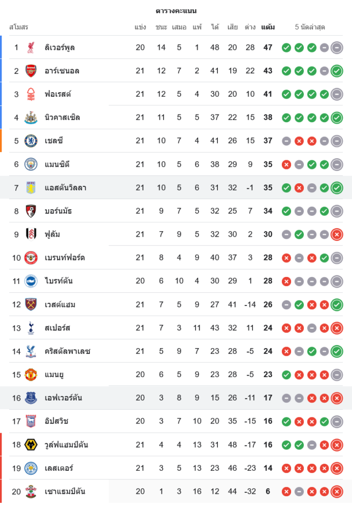 แอสตัน วิลล่า ขยับขึ้นมาอยู่อันดับ 7 ด้วย 35 คะแนนจาก 21 นัด ขณะที่เอฟเวอร์ตันยังคงอยู่อันดับ 16 มีเพียง 17 คะแนน และยังคงต้องดิ้นรนหนีตกชั้น