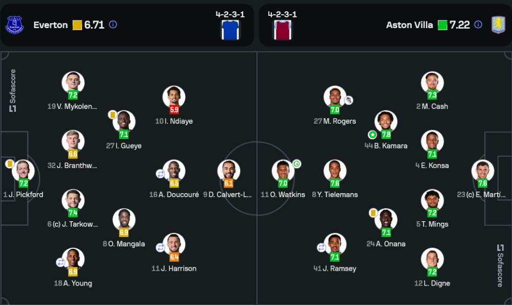 แอสตัน วิลล่าเลือกใช้แผน 4-2-3-1 ที่เน้นการครองบอลและสร้างสรรค์โอกาสผ่านแดนกลาง โดยมี บูบาการ์ กามาร่า และ ยูริ ตีเลอม็องส์ ช่วยสนับสนุนแนวรุก ออลลี่ วัตกิ้นส์ และมอร์แกน โรเจอร์สที่ประสานงานได้อย่างลงตัว ขณะที่เอฟเวอร์ตันในแผนเดียวกันยังขาดความเฉียบคมในแดนหน้า การปรับตัวระหว่างเกมยังทำได้ไม่ดีเท่าที่ควร แม้มีจังหวะสวนกลับบ้างแต่ไม่สามารถทำประตูได้
