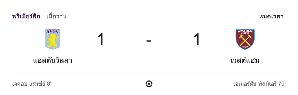จาก : ผลบอลสด พรีเมียร์ลีก 2024 ระหว่าง แอสตัน วิลล่า 1-1 เวสต์แฮมยูไนเต็ด วันนี้ 26/1/68 – บ้านกีฬา