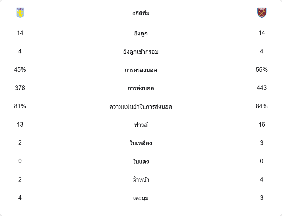 แอสตัน วิลล่า และ เวสต์แฮม มีโอกาสยิงเท่ากันที่ 14 ครั้ง โดยทั้งสองทีมยิงเข้ากรอบ 4 ครั้ง เวสต์แฮมครองบอลได้มากกว่าที่ 55% ขณะที่แอสตัน วิลล่าครองบอลได้ 45% เวสต์แฮมผ่านบอลได้มากกว่า 443 ครั้ง เทียบกับแอสตัน วิลล่าที่ 378 ครั้ง อัตราความแม่นยำในการส่งบอลของเวสต์แฮมอยู่ที่ 84% ส่วนแอสตัน วิลล่าอยู่ที่ 81% เกมนี้มีการฟาวล์รวมกันถึง 29 ครั้ง โดยเวสต์แฮมทำฟาวล์ 16 ครั้ง ส่วนแอสตัน วิลล่าทำฟาวล์ 13 ครั้ง
