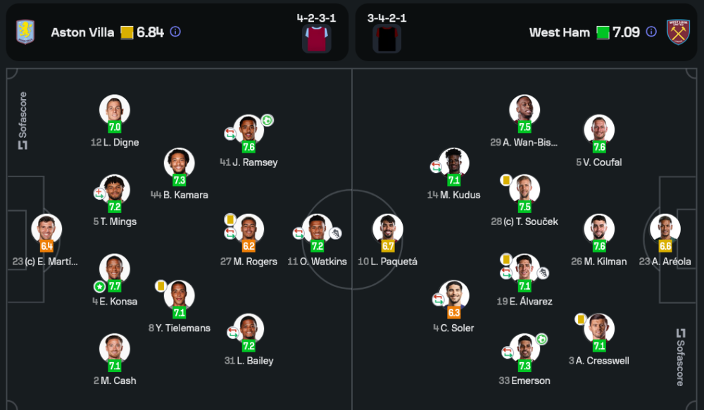 แอสตัน วิลล่า ใช้แผน 4-2-3-1 โดยพยายามคุมเกมแดนกลางและสร้างโอกาสจากการครองบอล เจค็อบ แรมซีย์ และโอลลี่ วัตกิ้นส์ เป็นแกนหลักในการทำเกมบุก แม้ว่าจะขึ้นนำได้ก่อน แต่ยังขาดความเฉียบขาดในการปิดเกม ส่วนเกมรับทำได้ดีพอสมควร แต่มีปัญหาในการรับมือเกมโต้กลับของเวสต์แฮม