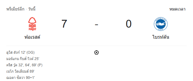 นาทีที่ 100: กรรมการเป่านกหวีดจบเกม น็อตติ้งแฮม ฟอเรสต์เอาชนะไบรท์ตัน 7-0