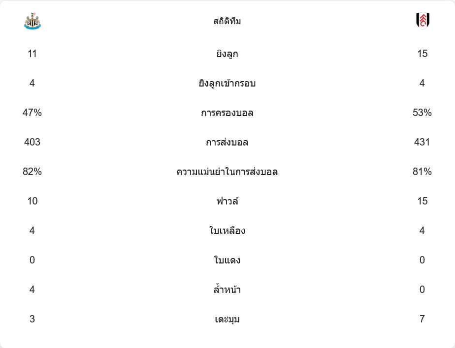 ฟูแล่มครองบอลได้ 53% เทียบกับนิวคาสเซิ่ลที่ 47% มีโอกาสยิงทั้งหมด 15 ครั้งเท่ากับเจ้าถิ่น แต่ความแม่นยำในการจบสกอร์ของทีมเยือนดูดีกว่า ทั้งสองทีมต่างมีใบเหลือง 4 ใบ แสดงให้เห็นถึงความดุดันในการเล่น จังหวะลูกเตะมุม ฟูแล่มทำได้ 7 ครั้ง ส่วนนิวคาสเซิ่ลได้ 3 ครั้ง ซึ่งแสดงถึงการสร้างโอกาสบุกที่มากกว่าของทีมเยือน