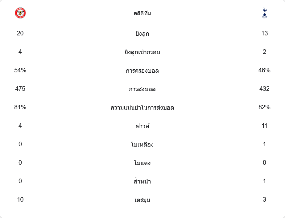 เบรนท์ฟอร์ดมีโอกาสยิงถึง 20 ครั้ง แต่เข้ากรอบเพียง 4 ครั้ง ในขณะที่สเปอร์สยิง 13 ครั้งและเข้ากรอบ 2 ครั้งซึ่งเป็น 2 ประตูสำคัญ การครองบอลของเจ้าบ้านอยู่ที่ 54% ส่วนสเปอร์สอยู่ที่ 46% ความแม่นยำในการส่งบอลของทั้งสองทีมสูสีกันโดยเบรนท์ฟอร์ดที่ 81% และสเปอร์ส 82% อย่างไรก็ตาม ความเด็ดขาดของสเปอร์สในการใช้โอกาสทำประตูเป็นจุดตัดสินสำคัญของเกมนี้