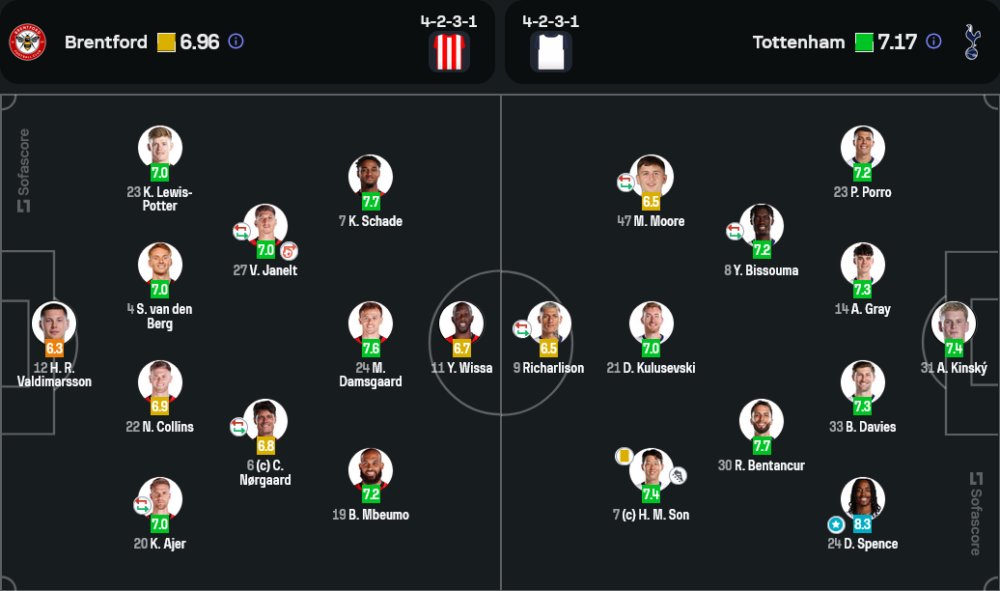 เบรนท์ฟอร์ดเลือกใช้แผน 4-2-3-1 เน้นการครองบอลและสร้างสรรค์เกมจากแดนกลาง แต่ขาดความเฉียบคมในการจบสกอร์ การบุกทางริมเส้นแม้จะทำได้ดีแต่ไม่สามารถทะลุแนวรับของสเปอร์สได้ สเปอร์สเองตอบโต้ด้วยแผน 4-2-3-1 เช่นกันแต่เน้นเกมสวนกลับที่รวดเร็ว การเคลื่อนที่ของ ซน ฮึง-มิน และความแม่นยำในการจ่ายบอลของ เบนตันกูร์ สร้างความแตกต่างชัดเจนในการจบสกอร์ การป้องกันของสเปอร์สมีความแน่นอนกว่าเบรนท์ฟอร์ด ทำให้ไม่เสียประตูแม้จะโดนกดดันหนัก