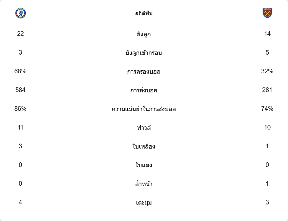 เกมนี้ เชลซี ครองบอลได้เหนือกว่าอย่างชัดเจนที่ 68% เทียบกับ 32% ของเวสต์แฮม การผ่านบอลของเชลซีสูงถึง 584 ครั้ง และมีความแม่นยำ 86% ขณะที่เวสต์แฮมส่งบอลเพียง 281 ครั้ง ด้วยความแม่นยำ 74% โอกาสยิงประตูเชลซีมีถึง 22 ครั้ง แต่เข้ากรอบเพียง 3 ครั้ง ส่วนเวสต์แฮมยิง 14 ครั้ง เข้ากรอบ 5 ครั้ง แสดงให้เห็นถึงความเด็ดขาดของเวสต์แฮมในจังหวะยิงประตู