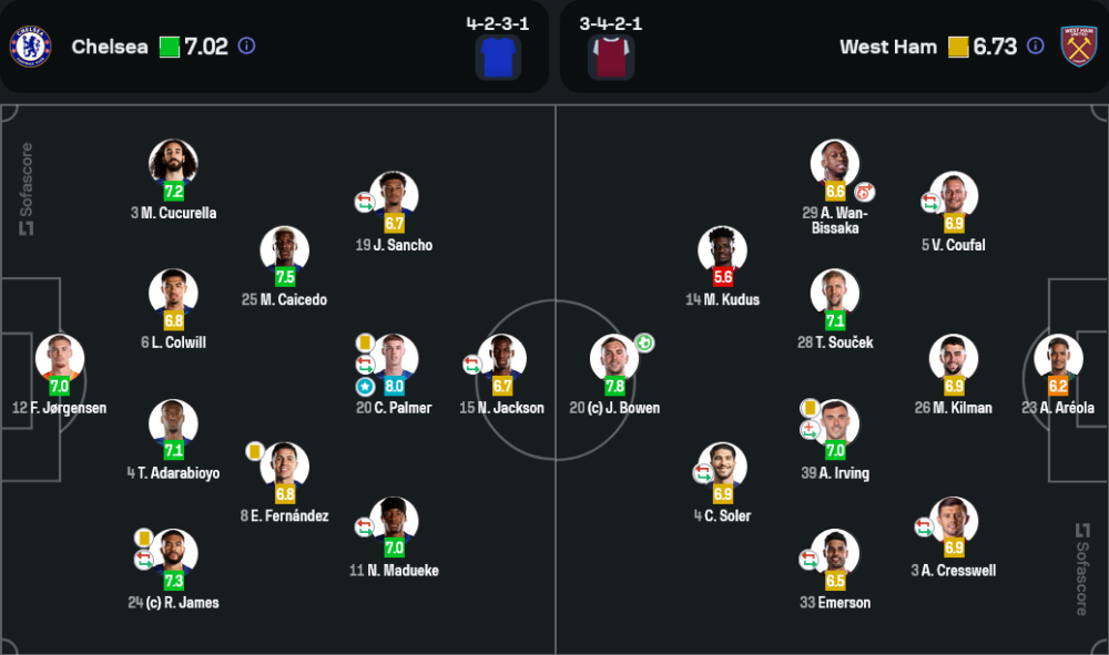 ฟอร์มอันยอดเยี่ยมของ โคล พาล์มเมอร์ ทำให้เขาได้รับคะแนนสูงสุดที่ 8.0 ในเกมนี้ เขาเป็นหัวใจสำคัญในเกมรุกของเชลซี ควบคุมจังหวะการเล่น และมีส่วนร่วมกับการสร้างสรรค์เกมตลอด 90 นาที