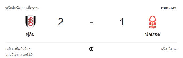 - นาทีที่ 96 กรรมการเป่านกหวีดจบเกม ฟูแล่มชนะน็อตติ้งแฮม ฟอเรสต์ 2-1
