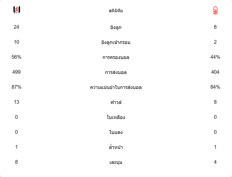 ฟูแล่ม ครองบอลได้ 56% และมีโอกาสยิงถึง 24 ครั้ง ขณะที่ ฟอเรสต์ ครองบอลเพียง 44% และยิงได้แค่ 8 ครั้ง ปัญหาของทีมเยือนคือการป้องกันลูกกลางอากาศที่เสียประตูจากลูกโหม่งของ บาสเซย์ นอกจากนี้แนวรุกของ ฟอเรสต์ ยังขาดความเฉียบคมในการเข้าทำ