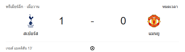 - นาทีที่ 97 หมดเวลาการแข่งขัน ท็อตแน่ม ฮ็อทสเปอร์ 1-0 แมนเชสเตอร์ ยูไนเต็ด ไก่เดือยทองเก็บสามแต้มสำคัญได้สำเร็จ!