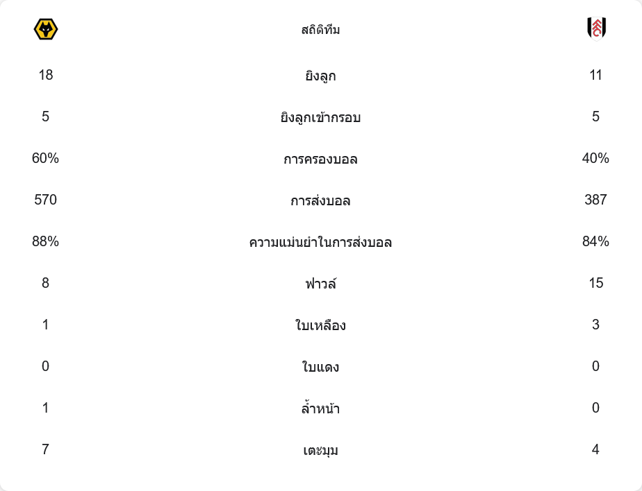 แม้ว่าวูล์ฟส์จะครองบอลได้มากกว่าที่ 60% และมีจำนวนการผ่านบอลที่ 570 ครั้ง เทียบกับ ฟูแล่ม 387 ครั้ง แต่ทีมเยือนมีความแม่นยำในการเข้าทำมากกว่า ฟูแล่มยิง 11 ครั้ง และเข้ากรอบเท่ากับวูล์ฟส์ที่ 5 ครั้ง เท่ากัน เกมนี้มีการทำฟาวล์ค่อนข้างเยอะ ฟูแล่มทำไป 15 ครั้ง และได้รับใบเหลือง 3 ใบ ขณะที่วูล์ฟส์ทำฟาวล์ 8 ครั้ง และได้ใบเหลือง 1 ใบ เตะมุม ฟูแล่มทำได้ 4 ครั้ง ส่วนวูล์ฟส์ได้ 7 ครั้ง แต่ไม่สามารถเปลี่ยนเป็นประตูได้