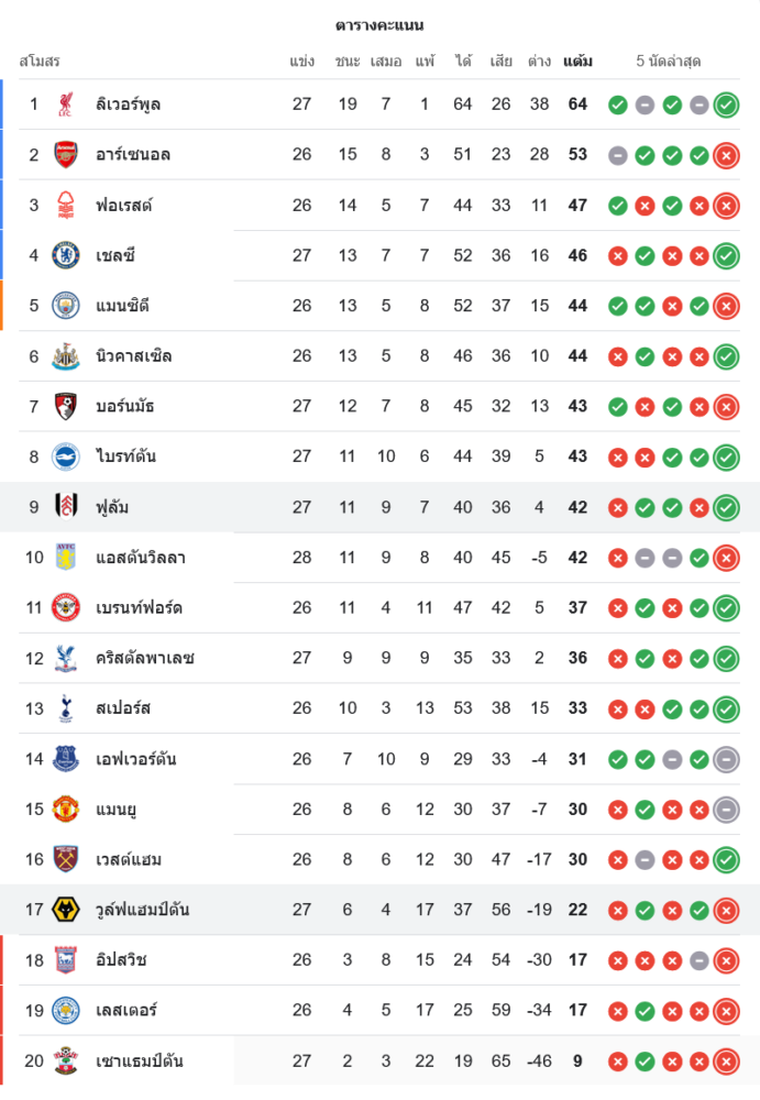ด้าน ฟูแล่ม ที่เพิ่งคว้าชัยเหนือวูล์ฟส์มาได้ มีคิวออกไปเยือน ไบรท์ตัน ในวันที่ 8 มีนาคม 2025 เวลา 22:00 น. เกมนี้จะเป็นการวัดกันระหว่างสองทีมที่กำลังไล่ล่าพื้นที่ยุโรป และอาจเป็นแมตช์ที่ชี้ชะตาอันดับของทั้งสองทีมได้เลย