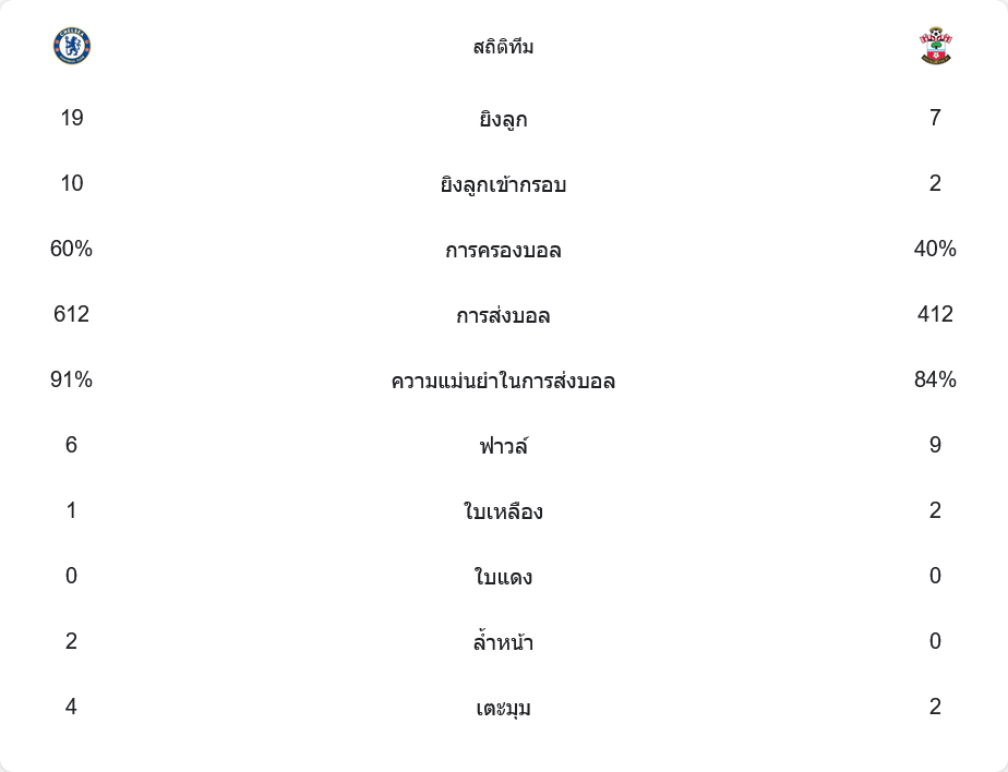 เชลซีครองบอลได้ 60% และมีจังหวะยิงทั้งหมด 19 ครั้ง โดยเข้ากรอบถึง 10 ครั้ง แสดงให้เห็นถึงการเข้าทำที่เฉียบขาด เกมรุกของพวกเขาหลากหลาย ทั้งการเจาะจากด้านข้างและการเข้าทำจากแนวลึก ส่วนการผ่านบอลมีความแม่นยำสูงถึง 91% ทำให้สามารถคุมเกมไว้ได้ทั้งหมด ด้านเซาแธมป์ตันครองบอลเพียง 40% และมีโอกาสยิงแค่ 7 ครั้ง เท่านั้น แสดงให้เห็นถึงปัญหาในแนวรุกและการสร้างสรรค์เกมที่ยังมีช่องโหว่มากมาย