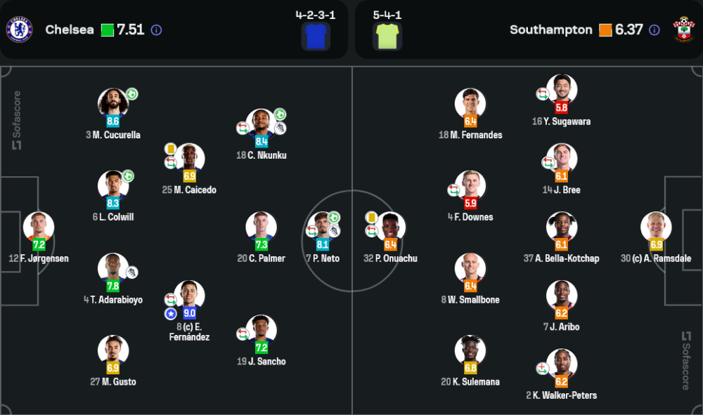 ตัวรุก: โคล พาลเมอร์ (7.3), เปโดร เนโต้ (8.1), จาดอน ซานโช่ (7.2)