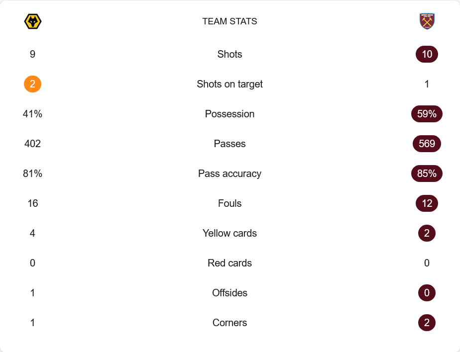 แม้ว่าการครองบอลจะเป็นของ เวสต์แฮม ที่สูงถึง 59% และการจ่ายบอลสำเร็จที่ 569 ครั้ง ด้วยความแม่นยำ 85% แต่การทำประตูไม่ได้ทำให้พวกเขาพ่ายแพ้ไป ขณะที่ วูล์ฟแฮมป์ตัน ครองบอลได้เพียง 41% จ่ายบอลสำเร็จ 402 ครั้ง ด้วยความแม่นยำ 81% แต่กลับมีประสิทธิภาพในการโจมตีมากกว่า และสามารถเก็บคลีนชีตได้อย่างยอดเยี่ยม
