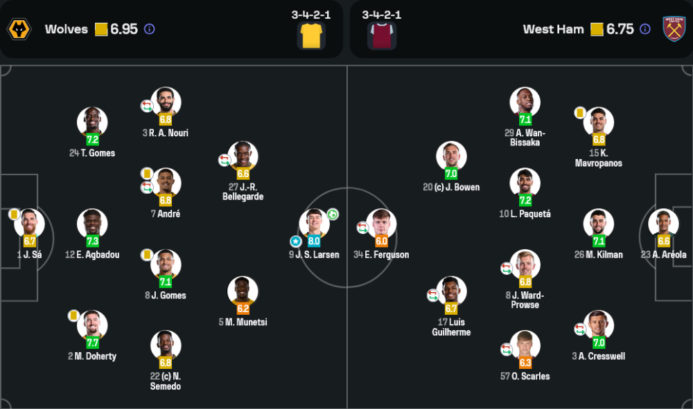 วูล์ฟแฮมป์ตัน ใช้แผน 3-4-2-1 เน้นการตั้งรับที่แข็งแกร่งและการโต้กลับอย่างรวดเร็ว ทำให้ เวสต์แฮม ที่ครองบอลได้มากถึง 59% ไม่สามารถเจาะแนวรับที่เหนียวแน่นของเจ้าบ้านได้ ทั้งนี้ เวสต์แฮม ใช้แผน 3-4-2-1 เช่นกัน แต่การบุกของพวกเขายังขาดความเฉียบคม โดยสามารถยิงเข้ากรอบเพียง 1 ครั้ง จากโอกาส 10 ครั้ง ขณะที่ วูล์ฟแฮมป์ตัน ยิงเข้ากรอบได้ 2 ครั้ง จาก 9 ครั้ง