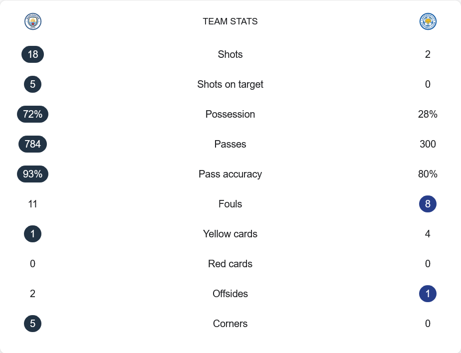 แมนเชสเตอร์ ซิตี้ คุมเกมได้ทั้งหมดโดยการครองบอลสูงถึง 72% และการผ่านบอลที่มีประสิทธิภาพกว่าอย่างชัดเจน ในขณะที่ เลสเตอร์ ซิตี้ พยายามตั้งรับและโต้กลับแต่กลับไม่สามารถสร้างโอกาสที่เป็นชิ้นเป็นอันได้ การจ่ายบอลที่ไม่แม่นยำและการครองบอลที่น้อยเกินไปทำให้พวกเขาแพ้อย่างราบคาบ
