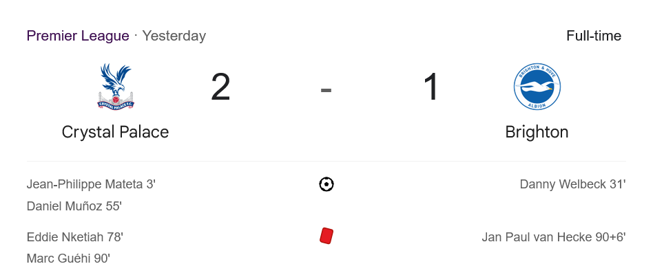 บ้านผลบอล สรุปหลังเกม คริสตัล พาเลซ เฉือนชนะ ไบรท์ตัน โฮฟ อัลเบี้ยน 2-1! ดราม่ากระหน่ำ ใบแดง โดนไล่ท้ายเกม