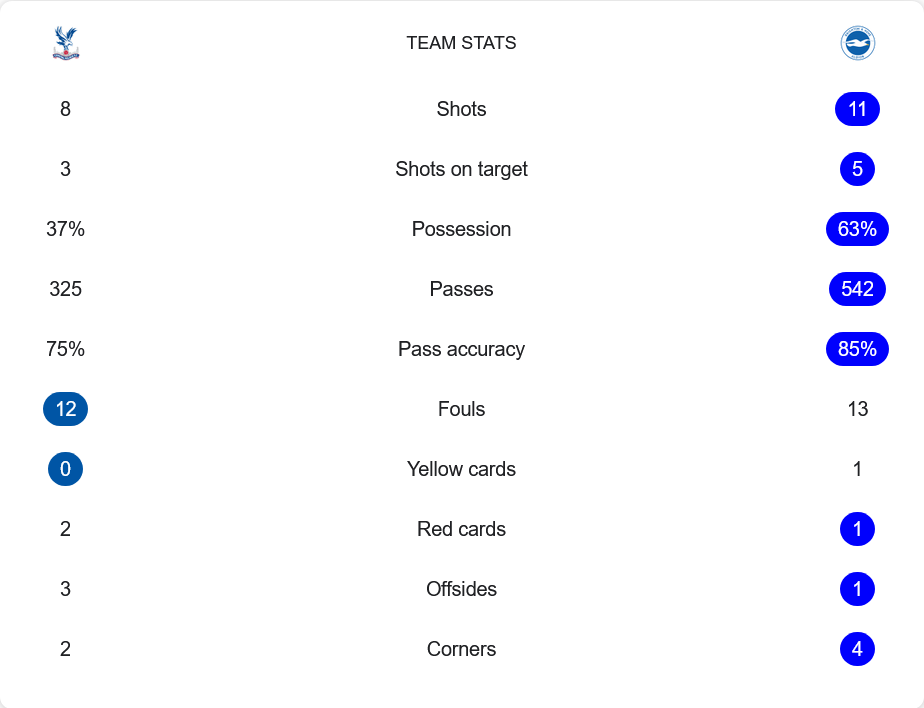 จากสถิติการแข่งขัน ไบรท์ตัน โฮฟ อัลเบี้ยน ครองบอลได้มากกว่าด้วยอัตราการครองบอลที่ 63% และการจ่ายบอลทั้งหมด 542 ครั้ง พร้อมความแม่นยำในการส่งบอลถึง 85% ขณะที่ คริสตัล พาเลซ ทำได้เพียงครองบอลที่ 37% และจ่ายบอลทั้งหมด 325 ครั้ง ด้วยความแม่นยำที่ 75%