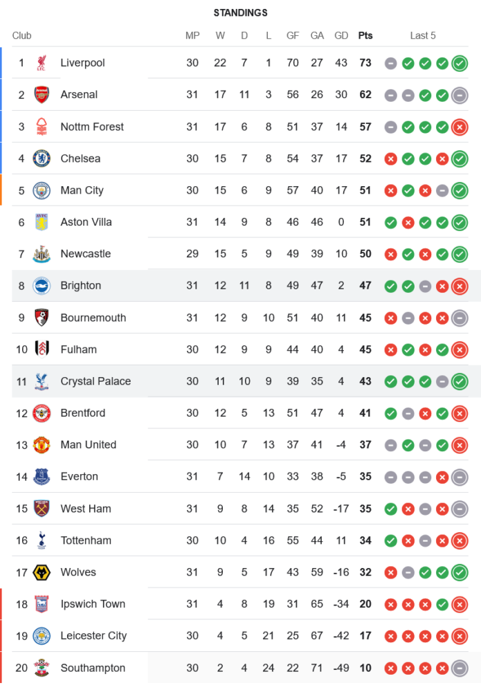 ส่วนทางด้าน ไบรท์ตัน โฮฟ อัลเบี้ยน การพ่ายแพ้ในนัดนี้ทำให้พวกเขาอยู่ในอันดับที่ 8 โดยมี 47 คะแนน จากการลงเล่น 31 นัด การแข่งขันเพื่อแย่งชิงพื้นที่ยุโรปยังคงเป็นเป้าหมายที่สามารถทำได้ หากพวกเขากลับมาเก็บชัยชนะในนัดถัดไป