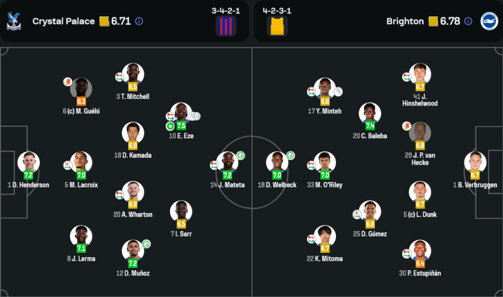 เกมนี้ คริสตัล พาเลซ ใช้แผนการเล่นแบบ 3-4-2-1 เน้นความแข็งแกร่งในแนวรับที่จัดเต็มด้วย มาร์ค เกฮี, แม็กซ์ เลอครัวซ์ และ แอนดรูว์ วาร์ตัน ที่ยืนเป็นกำแพงแน่นหนา พร้อมสนับสนุนการโจมตีจากแดนกลางที่มีทั้ง เอเบเรชี่ เอเซ่ และ ดาอิจิ คามาดะ ที่คอยสร้างสรรค์เกมรุกอย่างต่อเนื่อง การจ่ายบอลที่เฉียบคมและการควบคุมบอลที่ดีทำให้พวกเขาสามารถบุกทะลวงได้หลายครั้ง โดยเฉพาะการขึ้นเกมทางฝั่งซ้ายที่มี ดาเนียล มูนอซ และ ไทริค มิตเชลล์ สนับสนุนกันอย่างยอดเยี่ยม