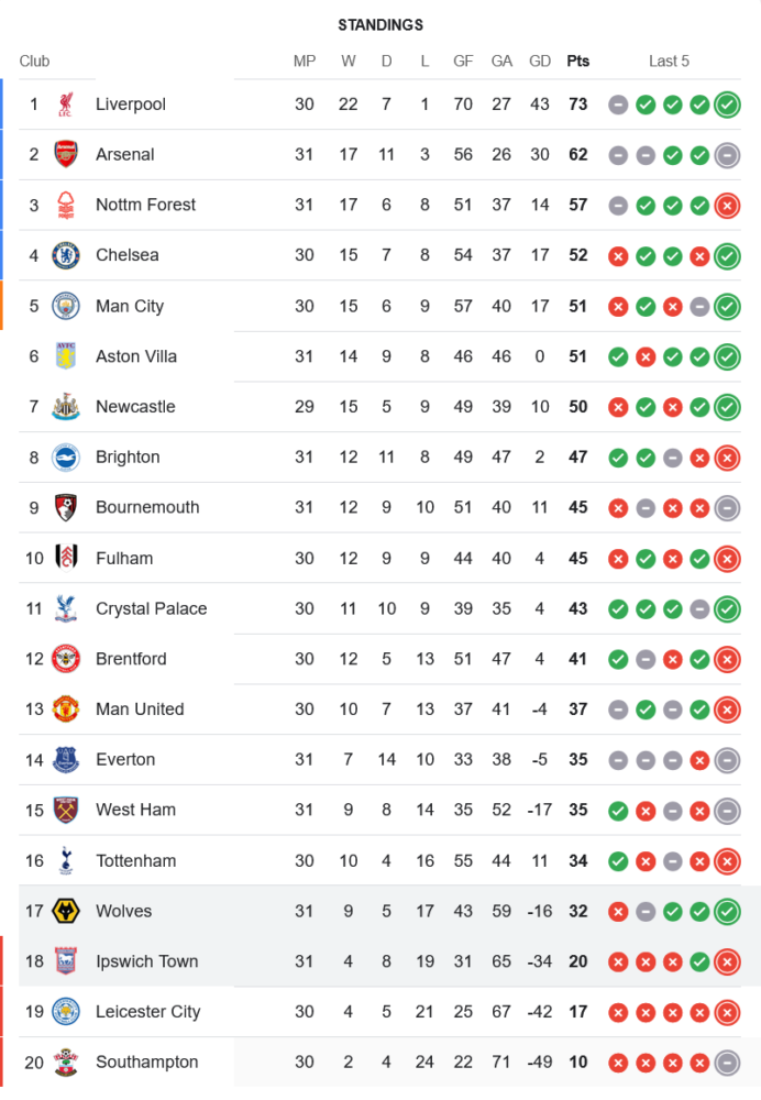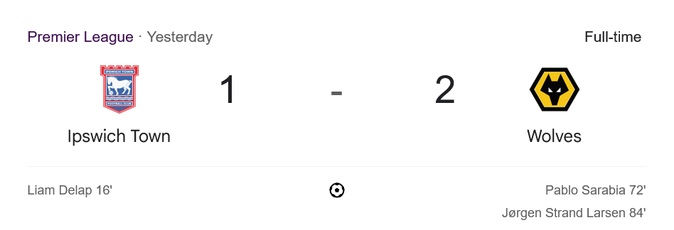 อิปสวิช ทาวน์ แม้จะพยายามสู้สุดใจแต่ก็ต้องพ่ายให้กับ วูล์ฟแฮมป์ตัน ไปด้วยสกอร์ 2-1 โปรแกรมต่อไปในตารางบอลพรีเมียร์ลีกของอิปสวิชคือการบุกไปเยือน เชลซี ในวันที่ 13 เมษายน 2025 เวลา 20:00 น. และกลับมาเล่นในบ้านเพื่อเจอกับ อาร์เซนอล ในวันที่ 20 เมษายน 2025 เวลา 20:00 น. บ้านกีฬาเห็นว่าการเก็บแต้มจากสองเกมนี้สำคัญอย่างยิ่งสำหรับการหนีตกชั้น