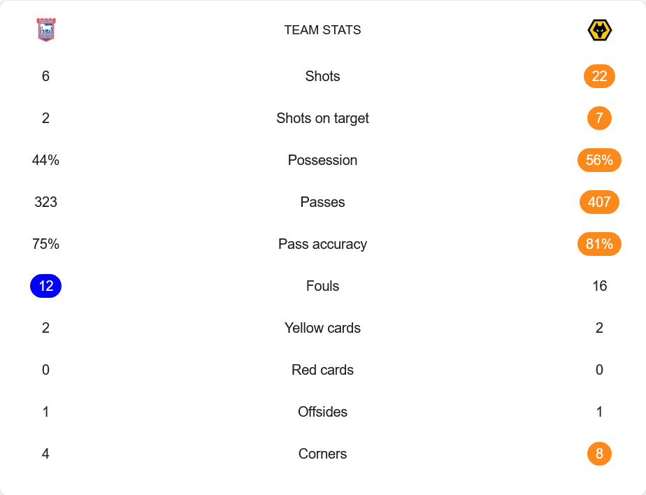 วูล์ฟแฮมป์ตัน คุมเกมได้เหนือกว่าอย่างชัดเจนด้วยการครองบอลถึง 56% และทำการจ่ายบอลทั้งหมด 407 ครั้ง พร้อมความแม่นยำที่ 81% ขณะที่ อิปสวิช ทาวน์ ครองบอลได้เพียง 44% และทำการจ่ายบอลทั้งหมด 323 ครั้ง ด้วยความแม่นยำที่ 75%