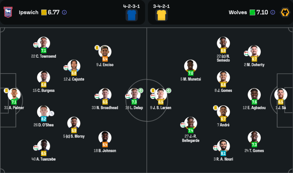 เกมนี้ อิปสวิช ทาวน์ ใช้แผนการเล่นแบบ 4-2-3-1 ซึ่งเน้นการตั้งรับอย่างมีระเบียบและรอสวนกลับอย่างรวดเร็ว โดยมี เลียม เดลาป เป็นกองหน้าตัวเป้าคอยปั่นป่วนแนวรับของ วูล์ฟแฮมป์ตัน พร้อมด้วยการสนับสนุนจาก แนท บรอดเฮด, จูลิโอ เอนซิโซ และ คาลัม ทาวน์เซนด์ ที่ช่วยกันสร้างโอกาสทำประตูอย่างต่อเนื่อง การใช้ผู้เล่นในตำแหน่งกองกลางตัวรับอย่าง แซม มอร์ซี่ และ เจสเปอร์ ไคจัสต์ ช่วยสร้างสมดุลให้กับทีมได้ดี แต่ยังคงมีช่องโหว่ในการรับมือกับการบุกของทีมคู่แข่ง