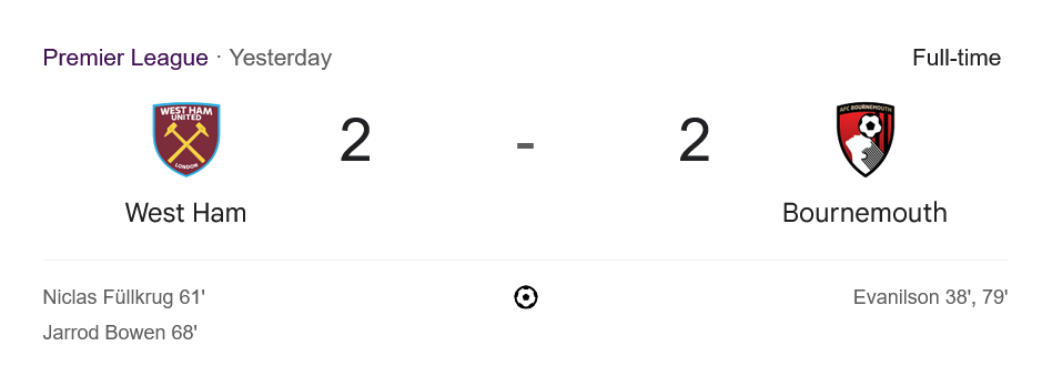 บ้านผลบอล สรุปหลังเกม เวสต์แฮม ยูไนเต็ด ปะทะ บอร์นมัธ สุดมันส์! เสมอกันแบบดุเดือด 2-2 ศึกพรีเมียร์ลีก 2025