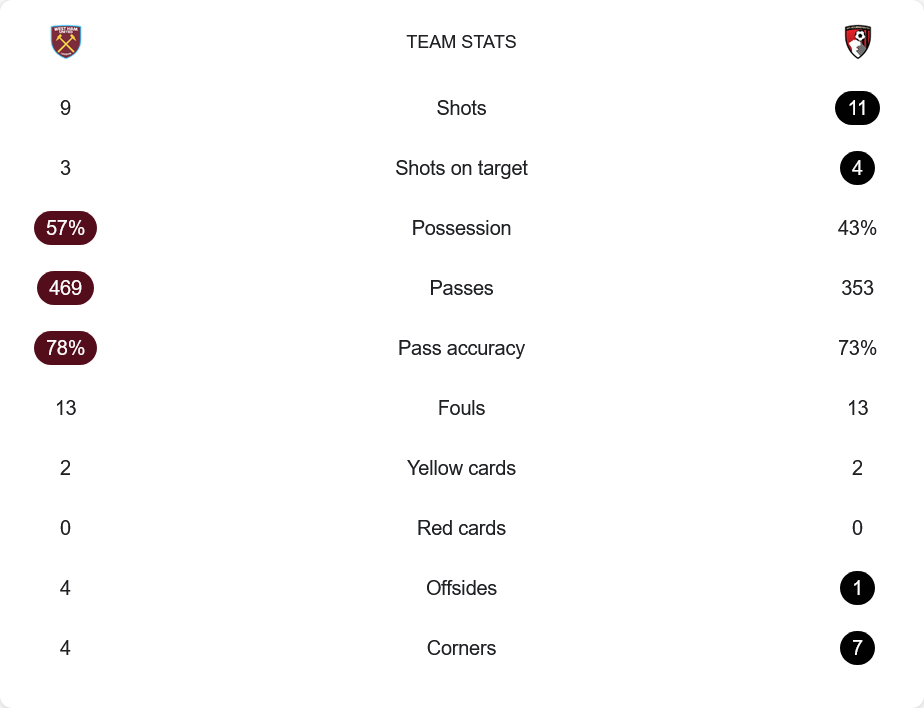 ทั้งสองทีมมีโอกาสยิงรวมกันถึง 20 ครั้ง โดย เวสต์แฮม ยูไนเต็ด ยิงไป 9 ครั้ง เข้ากรอบ 3 ครั้ง ขณะที่ บอร์นมัธ มีโอกาสยิง 11 ครั้ง เข้ากรอบ 4 ครั้ง การต่อสู้ที่ดุเดือดนี้ยังทำให้เกิดการฟาวล์ถึง 13 ครั้งเท่ากัน และแต่ละทีมได้รับใบเหลือง 2 ใบ โดยไม่มีการแจกใบแดงแต่อย่างใด