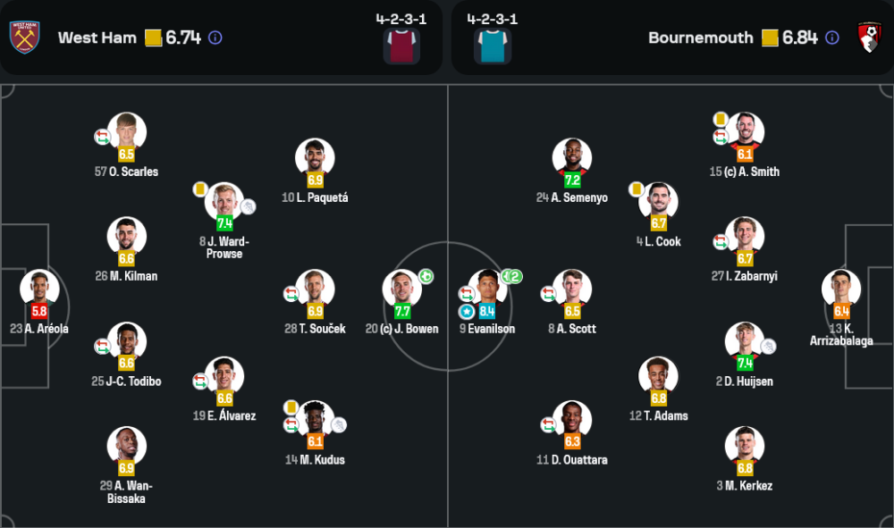 เอแวนิลสัน ของ บอร์นมัธ คว้าตำแหน่ง Player of the Match ไปครองด้วยคะแนนสูงถึง 8.4 จากการยิง 2 ประตูที่สำคัญ ทำให้ทีมสามารถคว้าคะแนนสำคัญจากการเสมอกับ เวสต์แฮม ยูไนเต็ด ได้อย่างยอดเยี่ยม