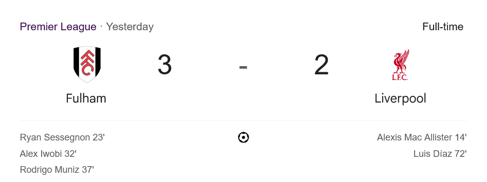 จาก : ผลบอลสด พรีเมียร์ลีก 2025 ระหว่าง ฟูแล่ม 3-2 ลิเวอร์พูล วันนี้ 6/4/68 – บ้านกีฬา