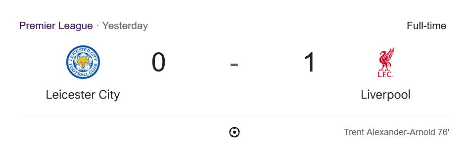 ครึ่งหลัง ลิเวอร์พูลเดินเครื่องเต็มสูบ บุกกระหน่ำอย่างหนักจนเลสเตอร์ตั้งตัวแทบไม่ทัน จังหวะการทำเกมริมเส้นทั้งฝั่งซ้ายขวาสร้างปัญหาให้เจ้าถิ่นอย่างต่อเนื่อง และในที่สุดความพยายามก็เป็นผล นาทีที่ 76 เทรนต์ อเล็กซานเดอร์-อาร์โนลด์ ซัดฟรีคิกสุดคมเบียดเสาเข้าไปตุงตาข่าย ส่งหงส์แดงขึ้นนำ 1-0 หลังจากนั้นแม้เลสเตอร์จะพยายามตอบโต้บ้าง แต่โอกาสมีน้อยเกินไป จบเกมลิเวอร์พูลบุกเก็บสามแต้มสำคัญกลับบ้านได้แบบหืดขึ้นคอ