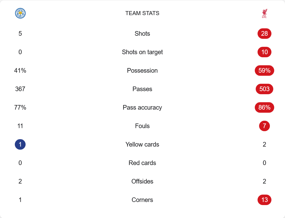 ตลอด 90 นาที ลิเวอร์พูลครองบอลได้ถึง 59% ต่อ 41% ของเลสเตอร์ ซิตี้ โดยหงส์แดงต่อบอลทั้งหมด 503 ครั้ง มีความแม่นยำ 86% ขณะที่เลสเตอร์ต่อบอลได้ 367 ครั้ง ด้วยความแม่นยำ 77% ด้านโอกาสยิง ลิเวอร์พูลสร้างโอกาสได้ถึง 28 ครั้ง และยิงตรงกรอบ 10 ครั้ง ขณะที่เลสเตอร์ยิงเพียง 5 ครั้ง และไม่มีแม้แต่ลูกเดียวที่ตรงกรอบ นอกจากนี้ ลิเวอร์พูลยังได้ลูกเตะมุมถึง 13 ครั้ง ขณะที่เลสเตอร์ได้เพียง 1 ครั้ง และเกมนี้มีใบเหลืองทั้งหมด 3 ใบ แบ่งเป็น เลสเตอร์ 1 ใบ ลิเวอร์พูล 2 ใบ