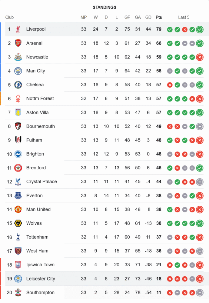 ชัยชนะนัดนี้ทำให้ลิเวอร์พูลเก็บเพิ่มเป็น 79 แต้ม นำจ่าฝูงต่อไปอย่างมั่นคงในศึก พรีเมียร์ลีก 2025 ขณะที่เลสเตอร์ ซิตี้ ยังคงจมปลักอยู่ในโซนตกชั้น อันดับ 19 มีเพียง 18 แต้มจาก 33 นัด สถานการณ์เข้าขั้นโคม่าเต็มตัว