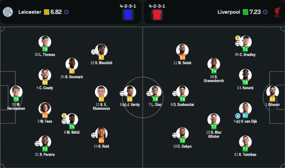 หาก วิเคราะห์บอล เกมนี้ ต้องบอกว่าลิเวอร์พูลโชว์คลาสของทีมลุ้นแชมป์ได้อย่างชัดเจน ด้วยแผน 4-2-3-1 ที่เน้นครองบอลบุกใส่เลสเตอร์อย่างต่อเนื่อง มีการสร้างสรรค์เกมรุกจากริมเส้นที่อันตรายมาก โดยเฉพาะฝั่งของหลุยส์ ดิอาซ ที่เล่นได้โดดเด่นสุดๆ ตรงกันข้าม เลสเตอร์ ซิตี้ มาในระบบ 4-2-3-1 เช่นกัน แต่เน้นตั้งรับลึก อาศัยการบีบพื้นที่และรอโอกาสสวนกลับอย่างเดียว แต่ปัญหาคือเกมสวนกลับของพวกเขาไร้ประสิทธิภาพจนไม่สามารถสร้างอันตรายได้จริงๆ แถมการครองบอลก็เป็นรองอย่างเห็นได้ชัดตลอดทั้งเกม